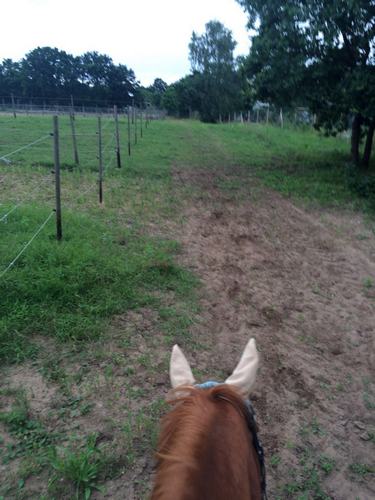 welche schon jetzt allen viel Freude bereitet. Einmal außen herum, am Springplatz vorbei, über die Koppeln und wieder zurück. Der Weg ist zur Hälfte aus Sand und zur anderen Hälfte mit Gras bewachsen. Leichte Hügel und Baumstämme als Hindernisse lassen die Strecken noch schöner erscheinen. Wer nicht gerne springt, galoppiert einfach um die Sprünge herum und genießt den Wind im Gesicht.