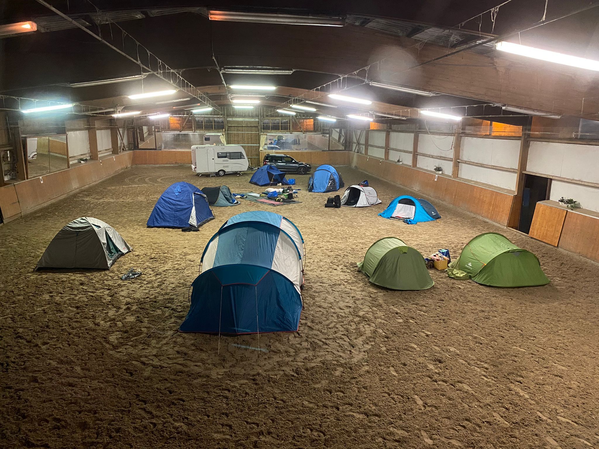 Bevor das Programm begann, wurden Samstagnachmittag die Zelte aufgebaut. Aufgrund des schlechten Wetters das erste Mal in der Reithalle des Ingelheimer Reitvereins. Die Zeltstadt in der Halle war ein einzigartiger Anblick und sogar ein Wohnwagen war mit dabei. Danach begann eine Kennenlern-Runde, um sich alle Namen merken zu können. Gar nicht so einfach, bei so vielen Leuten! Das diesjährige Abendessen bestand aus selbstbelegter Pizza, die im vereinseigenen Pizzaofen gebacken wurde und deswegen natürlich sehr viel leckerer war. Schnell war es dann auch schon dunkel und die Taschenlampen konnten ausgepackt werden, denn Auf ging es zu unserer Nachtwanderung. Ein kleines bisschen gruselig ist es in jedem Jahr. Nach der Rückkehr in den Stall wurde erstmalig Lagerfeuer gemacht. Mit Stockbrot und Marshmallows konnte man es dicht aneinander gekuschelt am Feuer gut aushalten, bei den kühlen Temperaturen und um der Tradition alle Ehre zu machen, wurde „Werwolf“ gespielt. Langsam wurden die Ersten müde und zogen sich in ihre Zelte zurück, bis der Kreis immer kleiner wurde und schließlich Ruhe im Stall einkehrte.