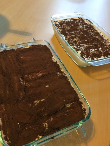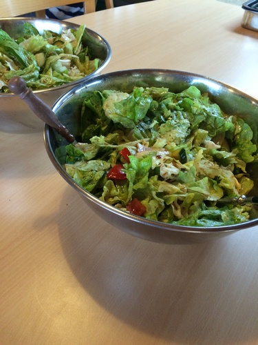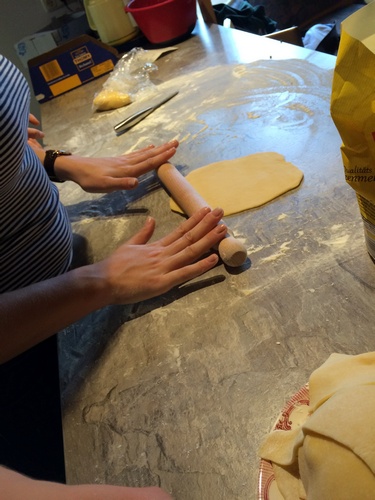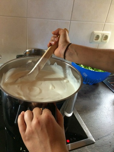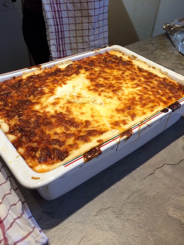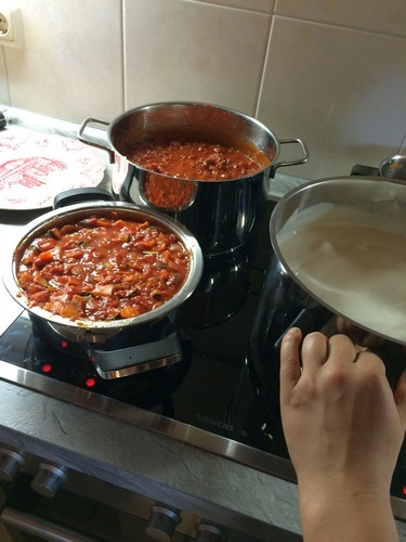 Insgesamt zwei Stunden lang waren wir beschäftigt mit Teig kneten, Soßen zubereiten, Gemüse schneiden, Salat waschen und den Nachtisch zuzubereiten. Die Lasagnen, vier an der Zahl, waren als erstes an der Reihe und es wurden Unmengen an Soße und Teig gebraucht um sie fertig zu stellen. Gleichzeitig schnippelten wir Gemüse für die zwei Salatschüsseln und letztendlich war das Tiramisu das große Highlight.