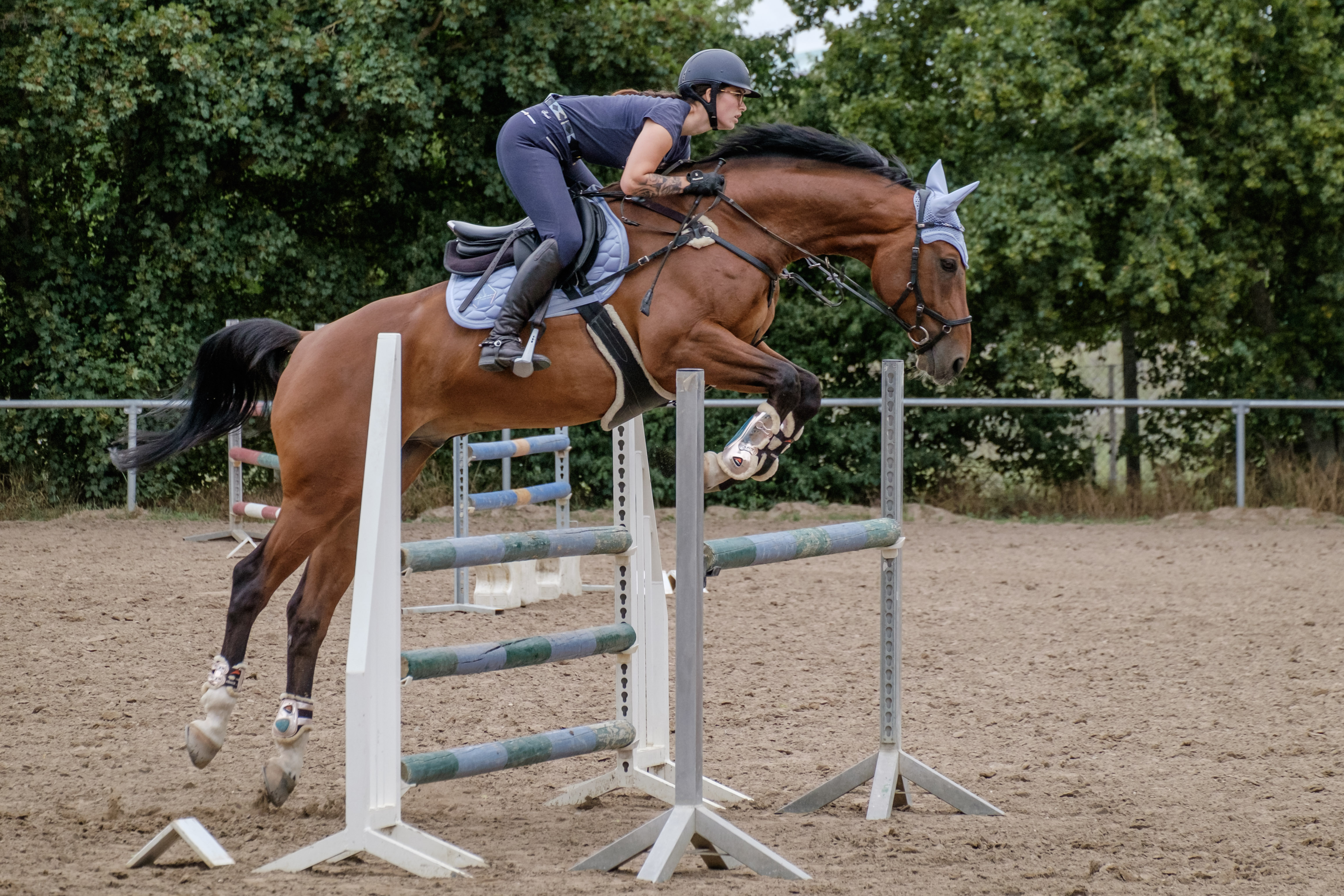 Das Besondere an diesem Lehrgang war, dass es ein Parcoursspringen war. Das bedeutet, dass alle Teilnehmer ihre Pferde selbstständig aufgewärmt haben, um dann im Training direkt einen ganzen Parcours springen zu können.